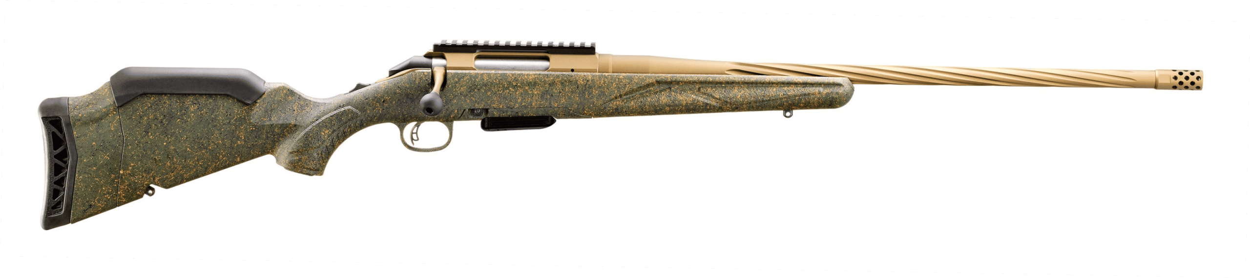 - Gen II Synthetic Stock with Green Splatter & Burnt Bronze Cerakote: The updated stock provides a more rigid and stable platform for enhanced accuracy, while the unique green splatter finish over a Burnt Bronze Cerakote barrel and receiver offers superior corrosion resistance and a rugged, tactical aesthetic that stands up to harsh environments.